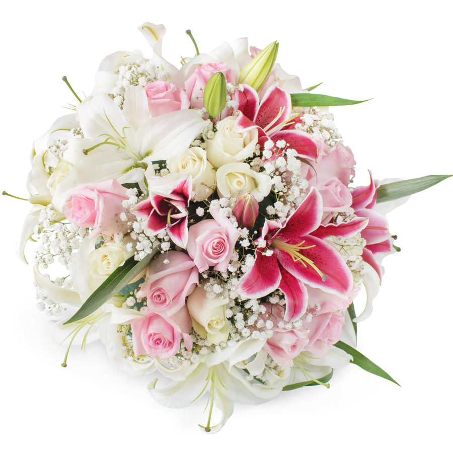 Add a touch of sophistication with our unique bouquet, featuring a beautiful assortment of white and pink roses, white lilium, purple oriental lilium, and gypsophila. Each bloom is hand-selected to ensure premium freshness and stunning appearance.