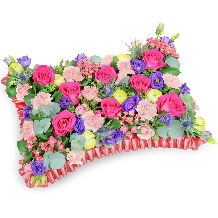Admire the beautiful and unique design of our pillow-shaped flower arrangement. Featuring a vibrant mix of roses, carnations, ranunculus, lisianthus, bouvardia, complemented by fresh eucalyptus and ruscus, this bouquet is an ideal way to express deep emotions and honor the memory of a loved one.