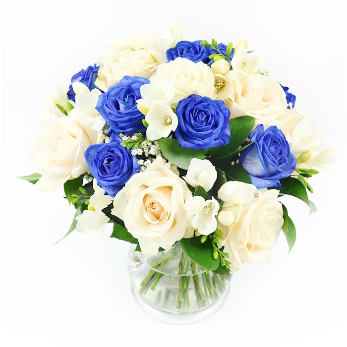 Show your deepest sympathies with our refined condolence flower arrangement, featuring a sophisticated combination of red and blue sprayed roses, white roses, freesia, gypsophila, and elegant greenery. Each flower is hand-picked to ensure exceptional quality and lasting freshness.